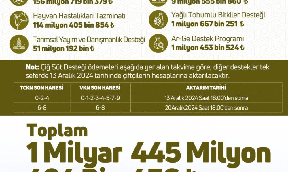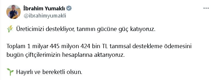 Bakan Yumaklı sosyal medya hesabından yaptığı açıklamada, “Üreticimizi destekliyor, tarımın gücüne güç katıyoruz. Toplam 1 milyar 445 milyon 424 bin TL tarımsal destekleme ödemesini bugün çiftçilerimizin hesaplarına aktarıyoruz. Hayırlı ve bereketli olsun” dedi.