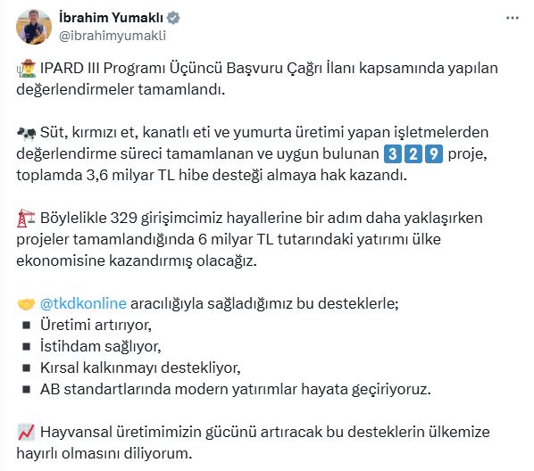 Tarım ve Orman Bakanı İbrahim Yumaklı, sosyal medya hesabından yaptığı açıklamada, “IPARD 3 Programı Üçüncü Başvuru Çağrı İlanı kapsamında yapılan değerlendirmeler tamamlandı. Süt, kırmızı et, kanatlı eti ve yumurta üretimi yapan işletmelerden değerlendirme süreci tamamlanan ve uygun bulunan 329 proje, toplamda 3,6 milyar TL hibe desteği almaya hak kazandı. Böylelikle 329 girişimcimiz hayallerine bir adım daha yaklaşırken projeler tamamlandığında 6 milyar TL tutarındaki yatırımı ülke ekonomisine kazandırmış olacağız” dedi.