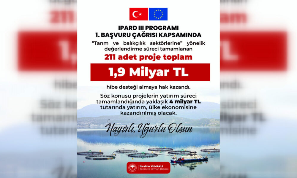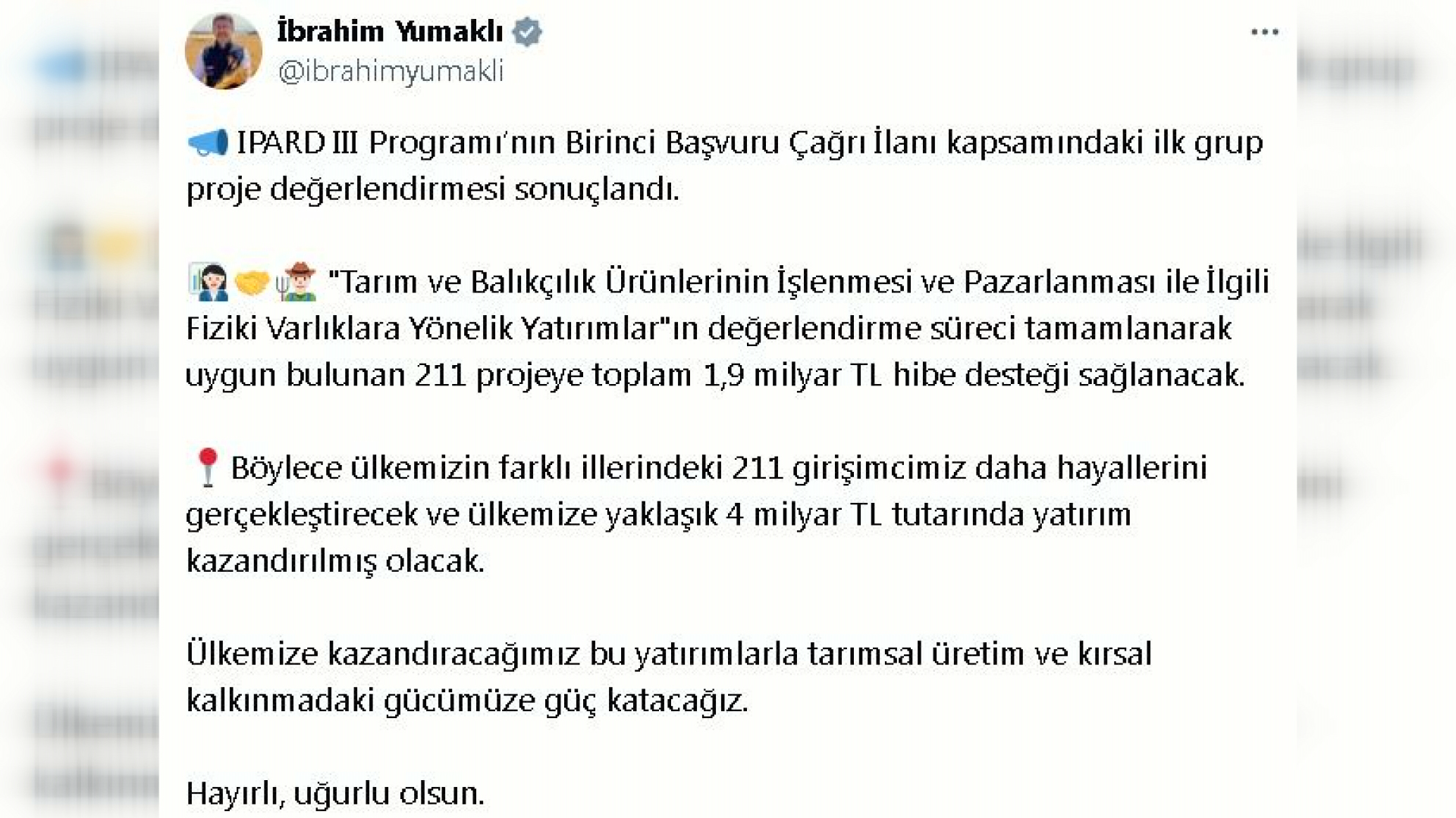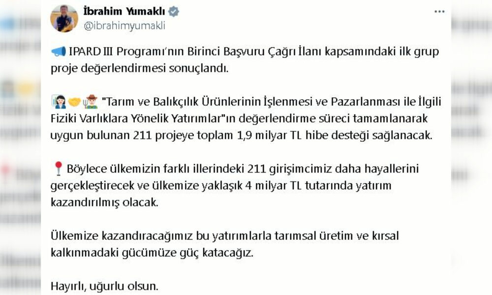 Bakan İbrahim Yumaklı, sosyal medya hesabından yaptığı açıklamada, “IPARD III Programının 1inci başvuru çağrı ilanı kapsamındaki ilk grup proje değerlendirmesi sonuçlandı. Tarım ve balıkçılık ürünlerinin işlenmesi ve pazarlanması ile ilgili fiziki varlıklara yönelik yatırımların değerlendirme süreci tamamlanarak uygun bulunan 211 projeye toplam 1,9 milyar TL hibe desteği sağlanacak. Böylece ülkemizin farklı illerindeki 211 girişimcimiz daha hayallerini gerçekleştirecek ve ülkemize yaklaşık 4 milyar TL tutarında yatırım kazandırılmış olacak. Ülkemize kazandıracağımız bu yatırımlarla tarımsal üretim ve kırsal kalkınmadaki gücümüze güç katacağız. Hayırlı, uğurlu olsun” ifadelerini kullandı.