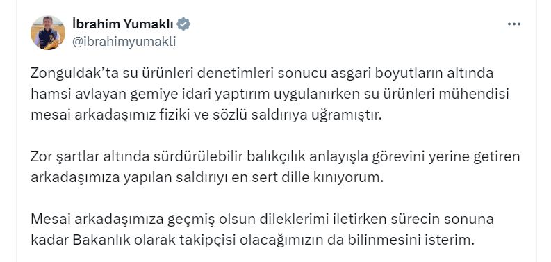 Bakan Yumaklı, sosyal medya hesabından yaptığı açıklamada, “Zonguldakta su ürünleri denetimleri sonucu asgari boyutların altında hamsi avlayan gemiye idari yaptırım uygulanırken su ürünleri mühendisi mesai arkadaşımız fiziki ve sözlü saldırıya uğramıştır. Zor şartlar altında sürdürülebilir balıkçılık anlayışla görevini yerine getiren arkadaşımıza yapılan saldırıyı en sert dille kınıyorum. Mesai arkadaşımıza geçmiş olsun dileklerimi iletirken sürecin sonuna kadar Bakanlık olarak takipçisi olacağımızın da bilinmesini isterim” ifadelerini kullandı.