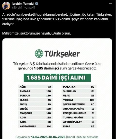 Bakan Yumaklı, sosyal medya hesabından yaptığı açıklamada, “Anadolunun bereketli topraklarına bereket, gücüne güç katan Türkşeker, 100üncü yaşında ülke genelinde 1685 daimi işçiye istihdam kapılarını aralıyor. Milletimize, sektörümüze hayırlı, uğurlu olsun” ifadelerini kullandı.