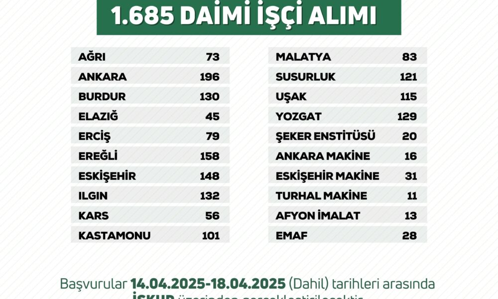 Başvuruların 14-17 Nisan 2025 tarihleri arasında Türkiye İş Kurumu (İŞKUR) üzerinden gerçekleşeceği belirtildi.