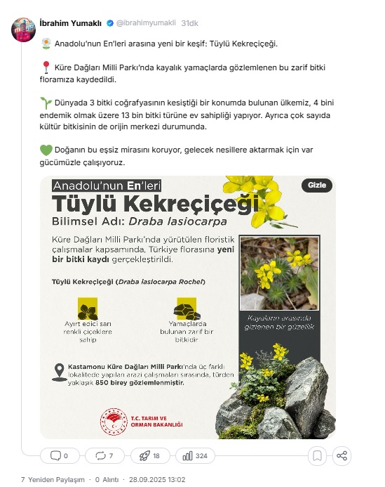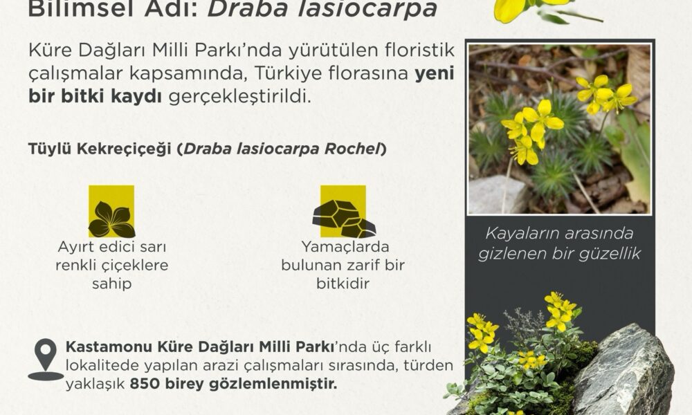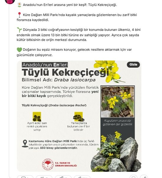 Bakan Yumaklı, NSosyal hesabından yaptığı açıklamada, “Anadolunun Enleri arasına yeni bir keşif: Tüylü Kekreçiçeği. Küre Dağları Milli Parkında kayalık yamaçlarda gözlemlenen bu zarif bitki floramıza kaydedildi. Dünyada 3 bitki coğrafyasının kesiştiği bir konumda bulunan ülkemiz, 4 bini endemik olmak üzere 13 bin bitki türüne ev sahipliği yapıyor. Ayrıca çok sayıda kültür bitkisinin de orijin merkezi durumunda. Doğanın bu eşsiz mirasını koruyor, gelecek nesillere aktarmak için var gücümüzle çalışıyoruz” dedi.