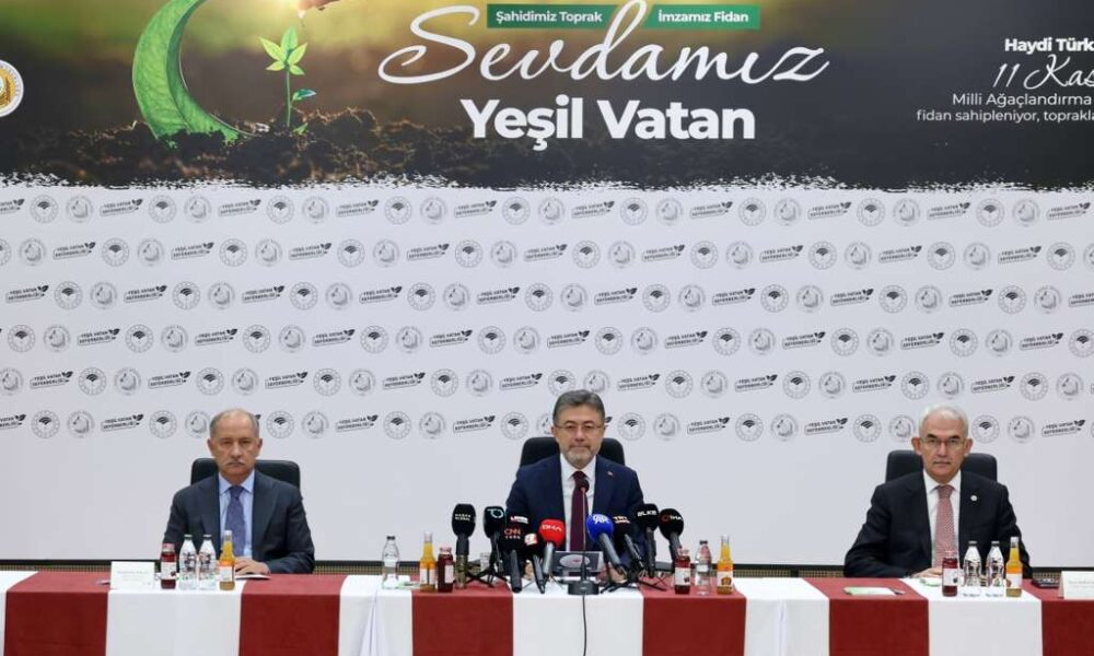 Tarım ve Orman Bakanı İbrahim Yumaklı, 11 Kasım Milli Ağaçlandırma Günü Kampanyasına ilişkin bakanlıkta basın toplantısı düzenlendi. Bakan Yumaklı, Cumhurbaşkanı Recep Tayyip Erdoğanın ortaya koyduğu 2053 Net Sıfır Emisyon hedefi ve Yeşil Kalkınma Devrimi vizyonunun, güçlü bir yol haritası sunduğunu belirterek, “Bizler orman alanlarımızı artırmaya, ormanlarımızı verimli hale getirmeye ve fidanlarımızı geleceğe umut olarak dikmeye devam ediyoruz. Son 23 yılda 7,5 milyar fidan ve tohumu toprakla buluşturduk. Orman varlığımızı 23,4 milyon hektara çıkardık. Böylece ülkemiz yüz ölçümünün yüzde 30u ormanlarla kaplı hale geldi. Türkiye, yaptığı bu çalışmalarla dünyada en fazla ağaçlandırma yapan ilk 4 ülke içine girdi. İklim değişikliğinin etkisiyle yangın riski artarken, biz de tecrübemiz ve teknik kapasitemizle, bu mücadeleyi en üst seviyede sürdürüyoruz. Önleme, söndürme ve rehabilite etme üzerine kurulu stratejimizle; İHAlardan modern hava filomuza, akıllı gözetleme kulelerinden yapay zeka destekli modellemelere kadar birçok yöntemle ormanlarımızı koruyoruz” dedi.