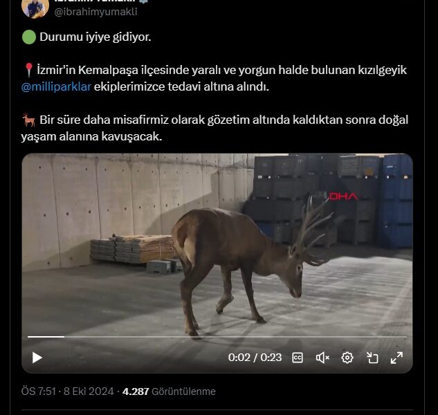 “Durumu iyiye gidiyor. İzmirin Kemalpaşa ilçesinde yaralı ve yorgun halde bulunan kızılgeyik, milli parklar ekiplerimizce tedavi altına alındı. Bir süre daha misafirimiz olarak gözetim altında kaldıktan sonra doğal yaşam alanına kavuşacak.”
