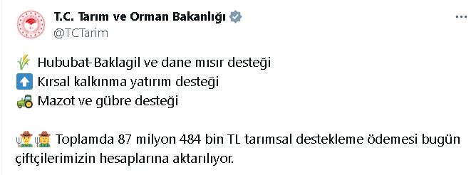 Bakanlığın sosyal medya hesabından yapılan açıklamada, “Hububat-Baklagil ve Dane Mısır Desteği, Kırsal Kalkınma Yatırım Desteği, Mazot ve Gübre Desteği; toplamda 87 milyon 484 bin lira tarımsal destekleme ödemesi bugün çiftçilerimizin hesaplarına aktarılıyor” denildi.