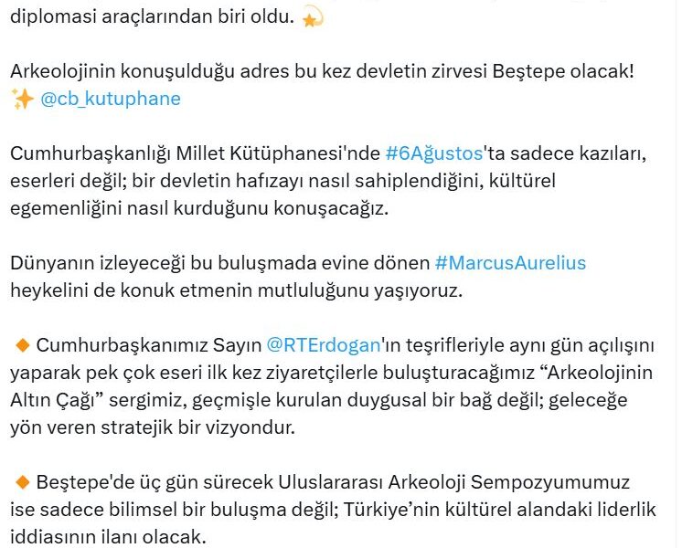 Kültür ve Turizm Bakanı Mehmet Nuri Ersoy da konuya ilişkin sosyal medya hesabından yaptığı açıklamada, “Tarihin toprak altındaki sessiz mirası, bugün artık Türkiyenin en güçlü diplomasi araçlarından biri oldu. Arkeolojinin konuşulduğu adres bu kez devletin zirvesi Beştepe olacak. Cumhurbaşkanlığı Millet Kütüphanesinde 6 Ağustosta sadece kazıları, eserleri değil; bir devletin hafızayı nasıl sahiplendiğini, kültürel egemenliğini nasıl kurduğunu konuşacağız. Dünyanın izleyeceği bu buluşmada evine dönen Marcus Aurelius heykelini de konuk etmenin mutluluğunu yaşıyoruz. Cumhurbaşkanımız Sayın Recep Tayyip Erdoğanın teşrifleriyle aynı gün açılışını yaparak, pek çok eseri ilk kez ziyaretçilerle buluşturacağımız Arkeolojinin Altın Çağı sergimiz, geçmişle kurulan duygusal bir bağ değil; geleceğe yön veren stratejik bir vizyondur. Beştepede üç gün sürecek Uluslararası Arkeoloji Sempozyumumuz ise sadece bilimsel bir buluşma değil; Türkiyenin kültürel alandaki liderlik iddiasının ilanı olacak. Binlerce yıllık medeniyetin evladı olarak artık sadece eser toplayan değil, anlam üreten, söylem kuran, kültürü ihraç eden bir ülkeyiz. Bu bilinçle attığımız her adım, Türkiye Yüzyılının kültürel temelini oluşturmaktadır” dedi.