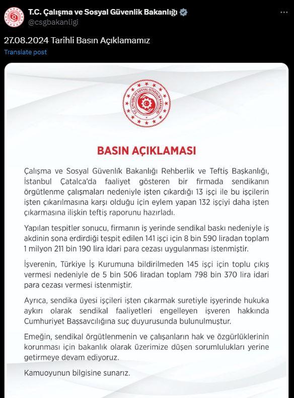 Bakanlıktan yapılan yazılı açıklamada, İstanbul Çatalcada faaliyet gösteren bir firmada sendikanın örgütlenme çalışmaları nedeniyle 13 kişinin işten çıkarıldığını ve ardından bu işçilerin işten çıkarılmasına karşı eylem yapan 132 işçinin daha işten çıkarıldığını hatırlattı. Konuyla ilgili Çalışma ve Sosyal Güvenlik Bakanlığı Rehberlik ve Teftiş Başkanlığı tarafından teftiş raporunun hazırlandığı belirtilerek, “Yapılan tespitler sonucu, firmanın iş yerinde sendikal baskı nedeniyle iş akdinin sona erdirdiği tespit edilen 141 işçi için 8 bin 590 liradan toplam 1 milyon 211 bin 190 lira idari para cezası uygulanması istenmiştir. İşverenin, Türkiye İş Kurumuna bildirilmeden 145 işçi için toplu çıkış vermesi nedeniyle de 5 bin 506 liradan toplam 798 bin 370 lira idari para cezası vermesi istenmiştir. Ayrıca, sendika üyesi işçileri işten çıkarmak suretiyle işyerinde hukuka aykırı olarak sendikal faaliyetleri engelleyen işveren hakkında Cumhuriyet Başsavcılığına suç duyurusunda bulunulmuştur. Emeğin, sendikal örgütlenmenin ve çalışanların hak ve özgürlüklerinin korunması için bakanlık olarak üzerimize düşen sorumlulukları yerine getirmeye devam ediyoruz” denildi.