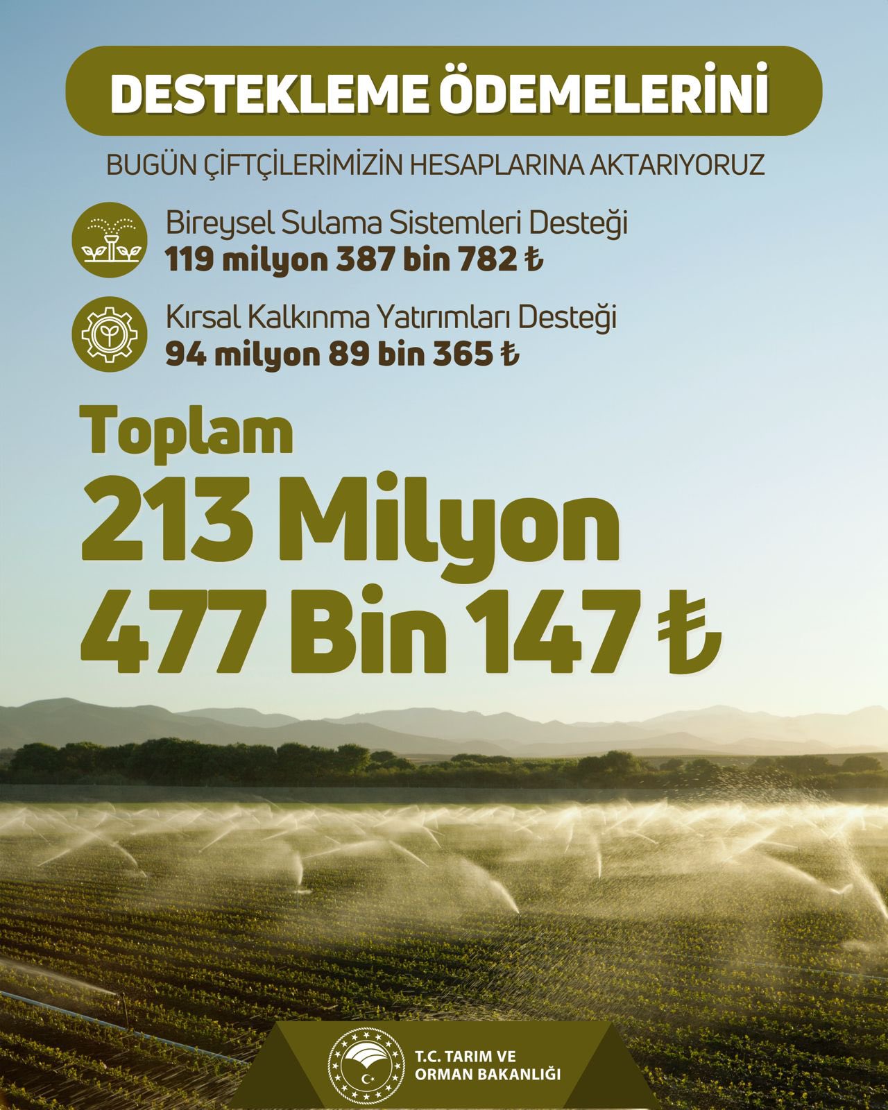 Bakanlığın sosyal medya hesabından yapılan açıklamada, bireysel sulama sistemleri desteği için 119 milyon 387 bin 782 TL, kırsal kalkınma yatırımları desteği kapsamında ise 94 milyon 89 bin 365 TL olmak üzere, toplamda 213 milyon 477 bin 147 TL tarımsal destekleme ödemesinin bugün çiftçilerin hesaplarına aktarılacağı bildirdi.