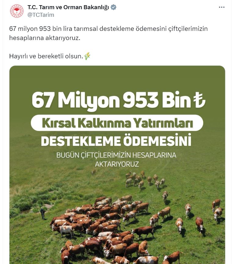 Bakanlığın sosyal medya hesabından yapılan açıklamada, “67 milyon 953 bin lira tarımsal destekleme ödemesini çiftçilerimizin hesaplarına aktarıyoruz. Hayırlı ve bereketli olsun” denildi.
