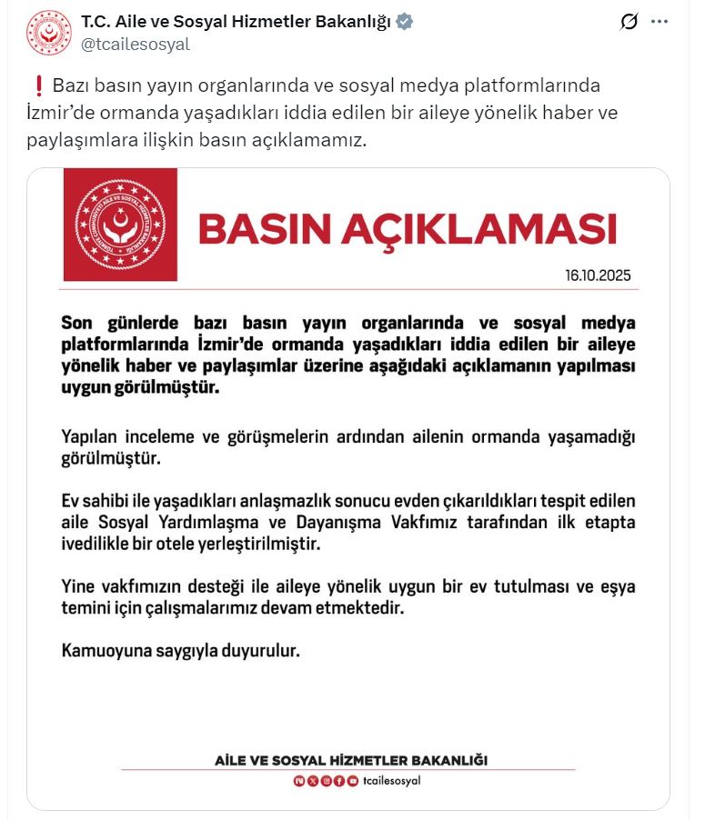 Bakanlığın sosyal medya hesabından yapılan açıklamada, “Son günlerde bazı basın yayın organlarında ve sosyal medya platformlarında İzmirde ormanda yaşadıkları iddia edilen bir aileye yönelik haber ve paylaşımlar üzerine aşağıdaki açıklamanın yapılması uygun görülmüştür. Yapılan inceleme ve görüşmelerin ardından ailenin ormanda yaşamadığı görülmüştür. Ev sahibi ile yaşadıkları anlaşmazlık sonucu evden çıkarıldıkları tespit edilen aile, Sosyal Yardımlaşma ve Dayanışma Vakfımız tarafından ilk etapta ivedilikle bir otele yerleştirilmiştir. Yine vakfımızın desteği ile aileye yönelik uygun bir ev tutulması ve eşya temini için çalışmalarımız devam etmektedir” denildi.