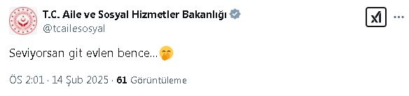 Bakanlığın sosyal medya hesabından 14 Şubat Sevgililer Günü nedeniyle paylaşım yapıldı. Paylaşımda, “Seviyorsan git evlen bence” denildi.