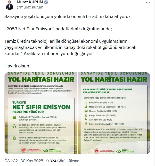 Konuyla ilgili sosyal medya hesabından açıklama yapan Çevre, Şehircilik ve İklim Değişikliği Bakanı Murat Kurum, “Sanayide yeşil dönüşüm yolunda önemli bir adım daha atıyoruz. 2053 Net Sıfır Emisyon hedeflerimiz doğrultusunda; temiz üretim teknolojileri ile döngüsel ekonomi uygulamalarını yaygınlaştıracak ve ülkemizin sanayideki rekabet gücünü artıracak kararlar 1 Aralıktan itibaren yürürlüğe giriyor. Hayırlı olsun” ifadelerini kullandı.