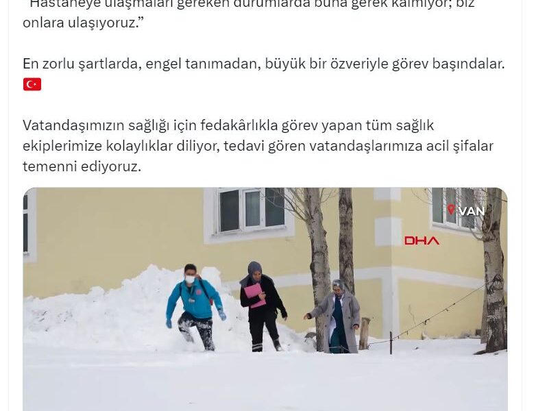 Bakanlığın sanal medya hesabından, Demirören Haber Ajansı’nın haberleştirdiği, Vanın Çaldıran ilçesinde görev yapan Doktor Didem Durgun ve beraberindeki sağlık ekibinin zorlu kış şartlarında hastalara evde hizmet verdiği görüntüler paylaşıldı. Paylaşımda Doktor Didem Durgunun, “Hastaneye ulaşmaları gereken durumlarda buna gerek kalmıyor; biz onlara ulaşıyoruz” ifadelerine yer verilerek, “En zorlu şartlarda, engel tanımadan, büyük bir özveriyle görev başındalar. Vatandaşımızın sağlığı için fedakarlıkla görev yapan tüm sağlık ekiplerimize kolaylıklar diliyor, tedavi gören vatandaşlarımıza acil şifalar temenni ediyoruz” denildi.