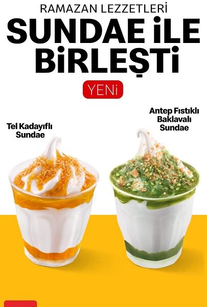 Ramazanda en çok tercih edilen şerbetli tatlılar arasında yer alan tel kadayıf ve Antep fıstıklı baklava lezzetleri, McDonalds Türkiyenin her yaştan misafirinin favorileri arasında bulunan Sundae ile bir araya geliyor. Geleneksel tatlıların damakta bıraktığı tadı kendine özgü dokunuşla Sundae ile buluşturan McDonalds Türkiye, iki yeni ürününü duyurdu.