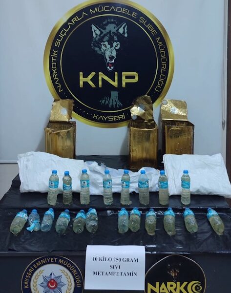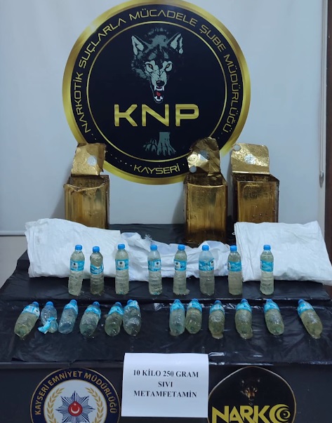 İl Emniyet Müdürlüğü Narkotik Suçlarla Mücadele Şube Müdürlüğü ekipleri, H.A.nın (35), il dışından kente uyuşturucu getirdiğini tespit etti. Bu kapsamda, H.A.’nın iş yerine operasyon düzenlendi. Yapılan aramalarda, bal tenekelerine ve pet şişelerine gizlenmiş 10 kilo 250 gram sıvı metamfetamin ele geçirildi. Gözaltına alınan H.A., polis merkezine götürüldü.