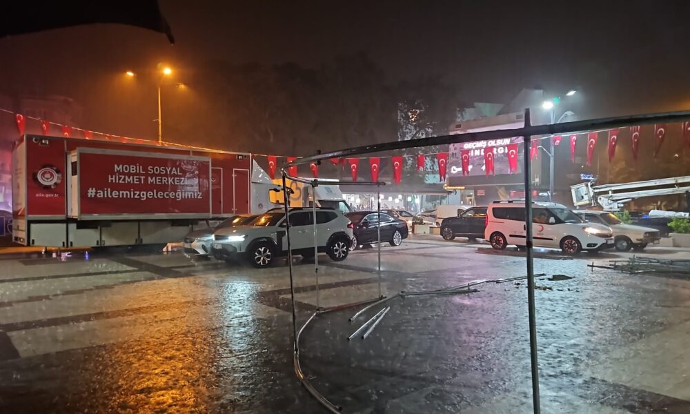 Sındırgı’da deprem toplanma alanı olan Cumhuriyet Meydanı’na belediye tarafından çadırlar kuruldu. Deprem korkusu nedeniyle evlerine giremeyen Sındırgılılar, yağmurun da başlamasıyla bu çadırların altında beklemeye başladı.