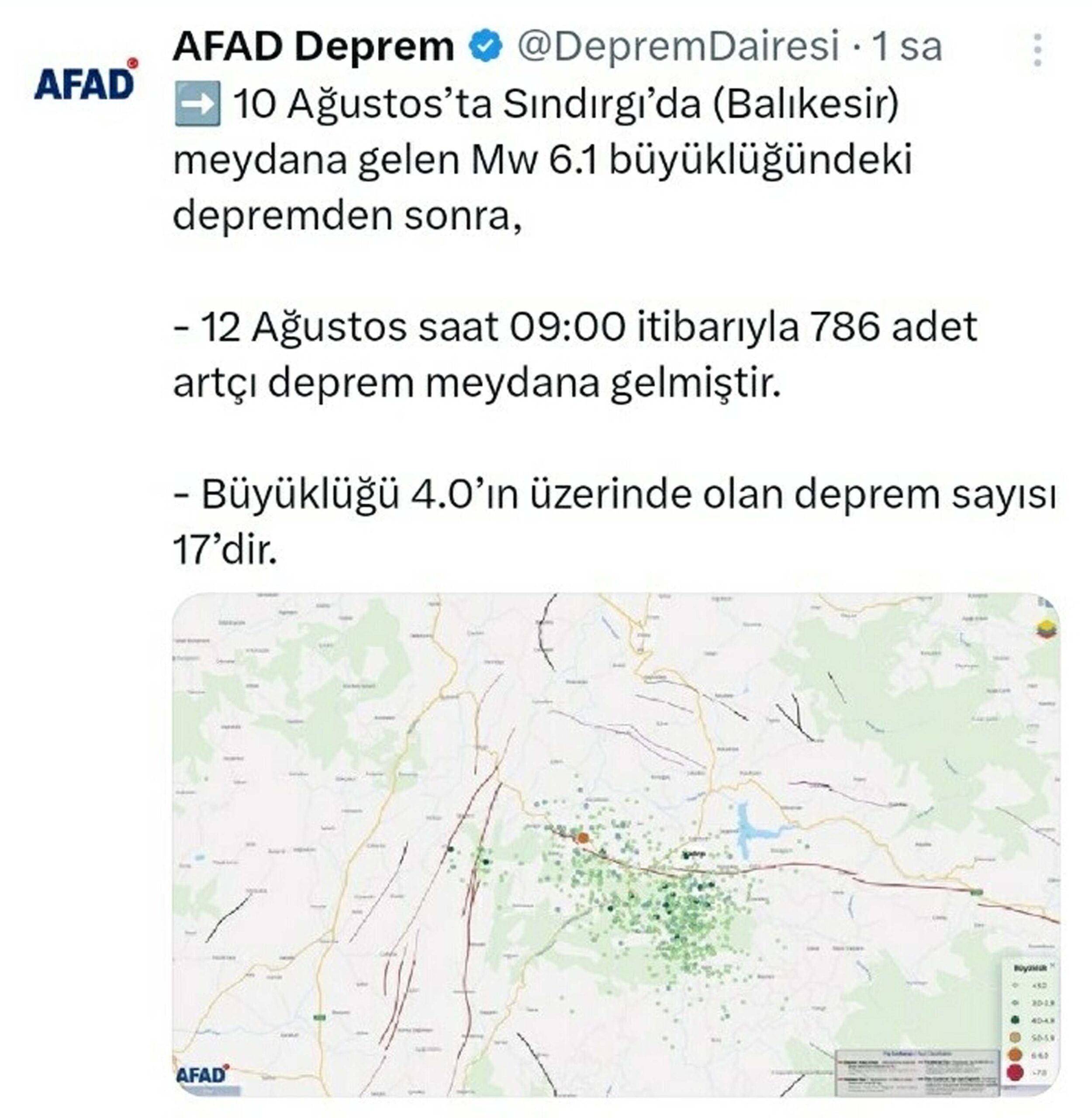 Afet ve Acil Durum Yönetim Başkanlığı (AFAD), önceki gün Balıkesirin Sındırgı ilçesinde meydana gelen 6.1 büyüklüğündeki depremin ardından yaşanan artçılara ilişkin açıklama yaptı. Açıklamada, “10 Ağustosta Sındırgıda (Balıkesir) meydana gelen Mw 6.1 büyüklüğündeki depremden sonra 12 Ağustos saat 09.00 itibarıyla 786 adet artçı deprem meydana gelmiştir. Büyüklüğü 4.0ın üzerinde olan deprem sayısı 17dir” denildi.