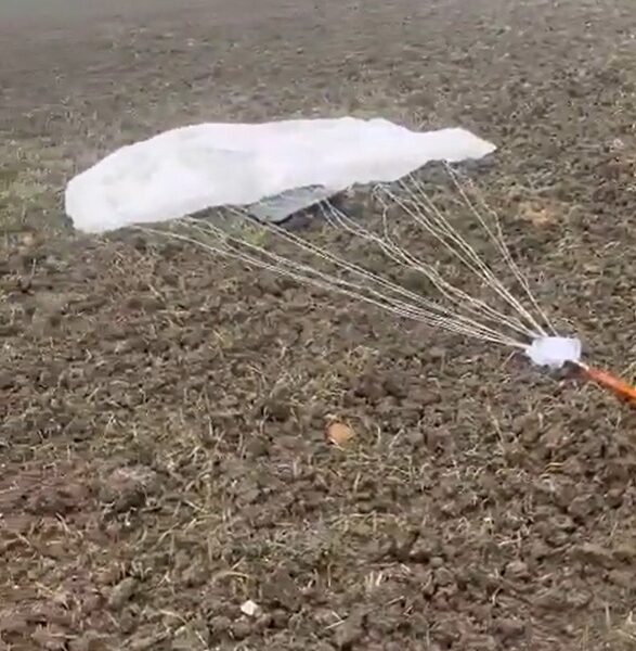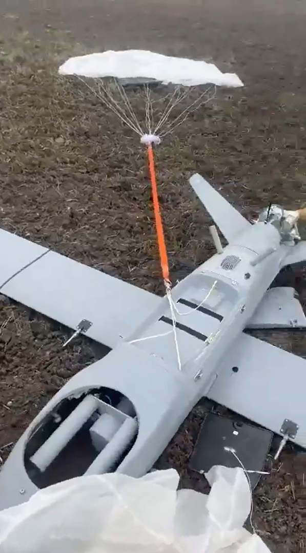 • Balıkesir'in Manyas ilçesindeki tarlaya 10 Aralık'ta düşen paraşütü açık bir insansız hava aracı (İHA), incelenmek üzere Ankara'ya götürüldü. Fotoğraf: Bursa, (DHA)