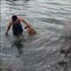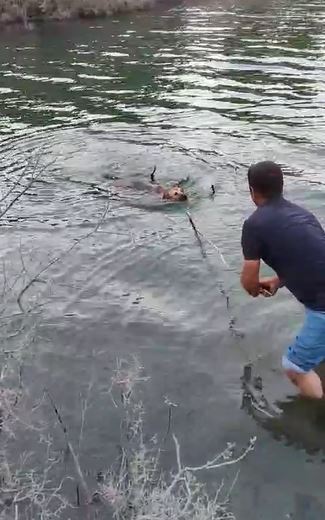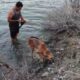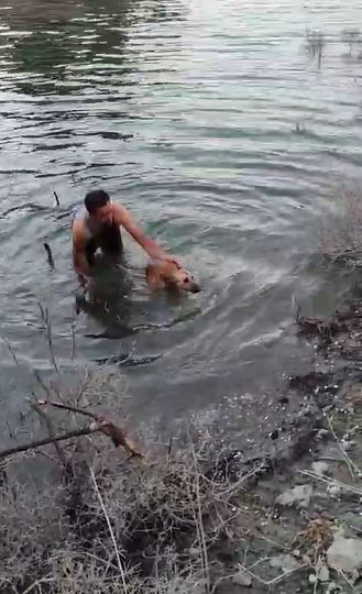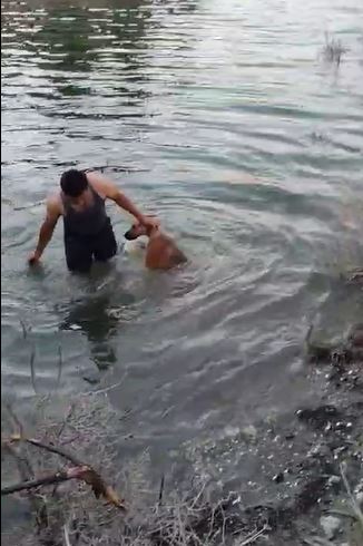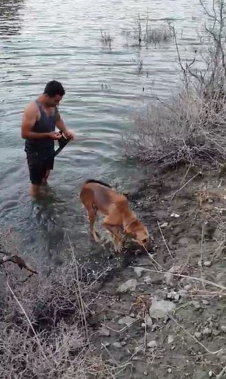 • Barajda mahsur kalan köpeği, suya girip kurtardı. Fotoğraf: Samandağ (Hatay), (DHA)