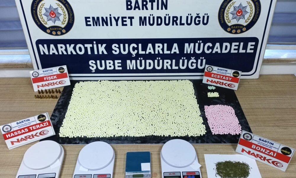Bartın Cumhuriyet Başsavcılığı tarafından uyuşturucu sattıkları belirlenen şüphelilere yönelik yürütülen soruşturma kapsamında, İl Emniyet Müdürlüğü Narkotik Suçlarla Mücadele Şube Müdürlüğü ekipleri, belirlenen adreslere eş zamanlı operasyon düzenledi. Bartın ve İstanbul’da, şüphelilerin adreslerinde yapılan aramalarda 4 bin 659 ecstasy hap, 4 hassas terazi, 3,38 gram sentetik bonzai ve 16 fişek ele geçirildi. Operasyonda 10 şüpheli gözaltına alındı. Emniyetteki işlemlerinin ardından adliyeye sevk edilen şüphelilerden 8’i, ‘Uyuşturucu ticareti yapmak’ suçundan tutuklandı, 2si ise adli kontrol şartıyla serbest bırakıldı.