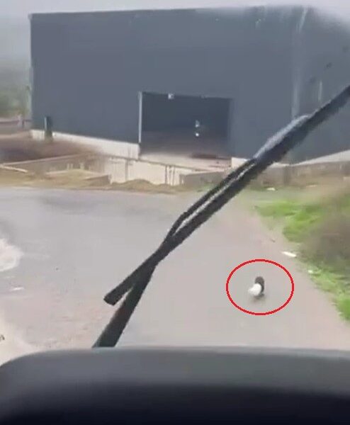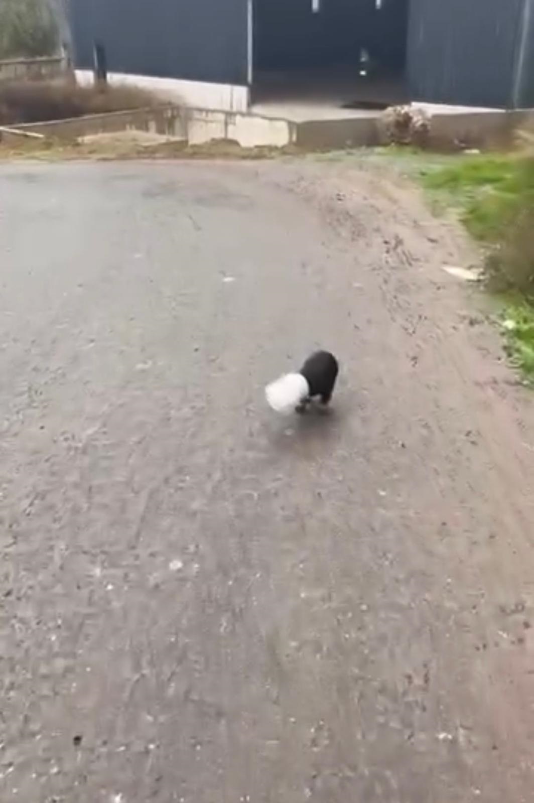 Çiftlikköy ilçesi Denizçalı köyü Handere mevkiinde bir hafriyat kamyonunun şoförü, yol ortasında başında plastik bir kap bulunan yavru köpeği fark etti. Aracını durdurup inerek köpeğin yanına giden şoför, plastik kabı çıkardı. O anları cep telefonu kamerasıyla kaydeden şoför, köpeği sevdikten sonra yoluna devam etti.