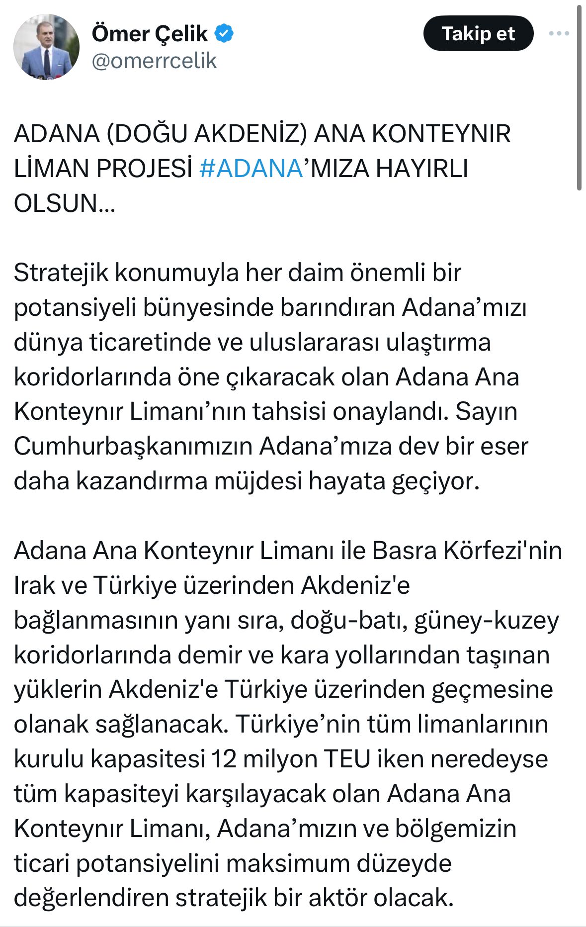 Sosyal medya hesabından paylaşım yapan AK Parti Sözcüsü ve Adana Milletvekili Ömer Çelik, Adana Ana Konteyner Limanının tahsisinin onaylandığını açıkladı. Çelik, paylaşımında, “Stratejik konumuyla her daim önemli bir potansiyeli bünyesinde barındıran Adanamızı dünya ticaretinde ve uluslararası ulaştırma koridorlarında öne çıkaracak olan Adana Ana Konteyner Limanının tahsisi onaylandı. Sayın Cumhurbaşkanımızın Adanamıza dev bir eser daha kazandırma müjdesi hayata geçiyor. Adana Ana Konteyner Limanı ile Basra Körfezinin Irak ve Türkiye üzerinden Akdenize bağlanmasının yanı sıra doğu-batı, güney-kuzey koridorlarında demir ve kara yollarından taşınan yüklerin Akdenize Türkiye üzerinden geçmesine olanak sağlanacak. Türkiyenin tüm limanlarının kurulu kapasitesi 12 milyon TEU iken neredeyse tüm kapasiteyi karşılayacak olan Adana Ana Konteyner Limanı, Adanamızın ve bölgemizin ticari potansiyelini maksimum düzeyde değerlendiren stratejik bir aktör olacak. Bu büyük projeyi Adanamıza ve bölgemize kazandıran Sayın Cumhurbaşkanımıza şükranlarımızı arz ediyoruz, ilgili Bakanlarımıza teşekkür ediyoruz” ifadelerini kullandı.