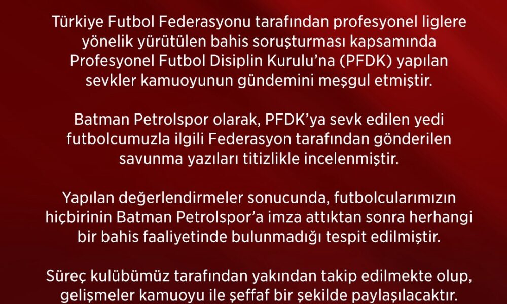 “Türkiye Futbol Federasyonu tarafından profesyonel liglere yönelik yürütülen bahis soruşturması kapsamında Profesyonel Futbol Disiplin Kurulu’na (PFDK) yapılan sevkler kamuoyunun gündemini meşgul etmiştir. Batman Petrolspor olarak, PFDK’ya sevk edilen 7 futbolcumuzla ilgili federasyon tarafından gönderilen savunma yazıları titizlikle incelenmiştir. Yapılan değerlendirmeler sonucunda, futbolcularımızın hiçbirinin Batman Petrolspor’a imza attıktan sonra herhangi bir bahis faaliyetinde bulunmadığı tespit edilmiştir. Süreç kulübümüz tarafından yakından takip edilmekte olup, gelişmeler kamuoyu ile şeffaf bir şekilde paylaşılacaktır.”
