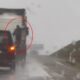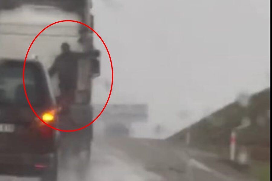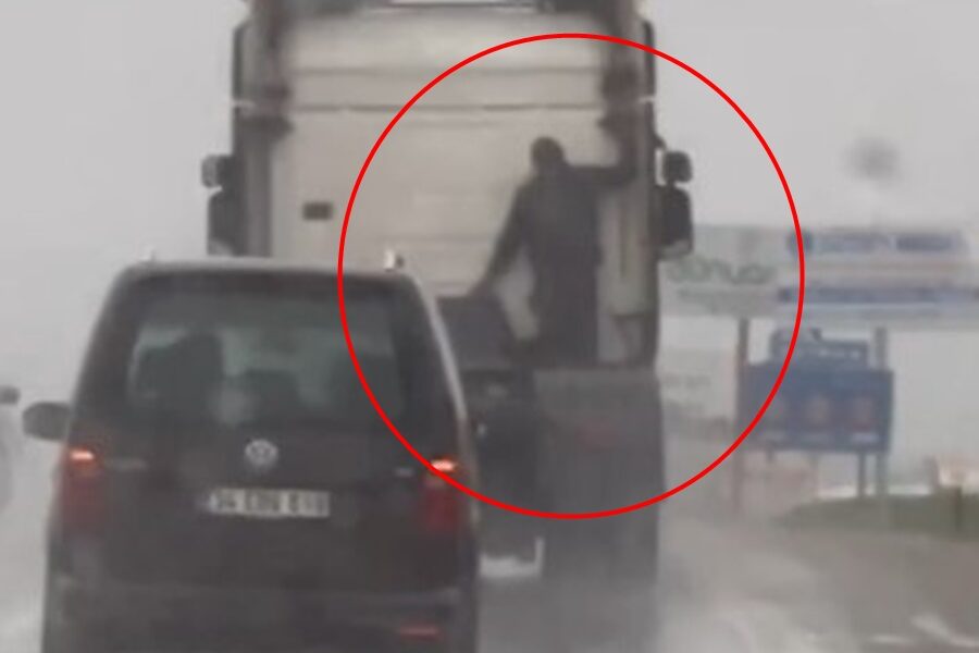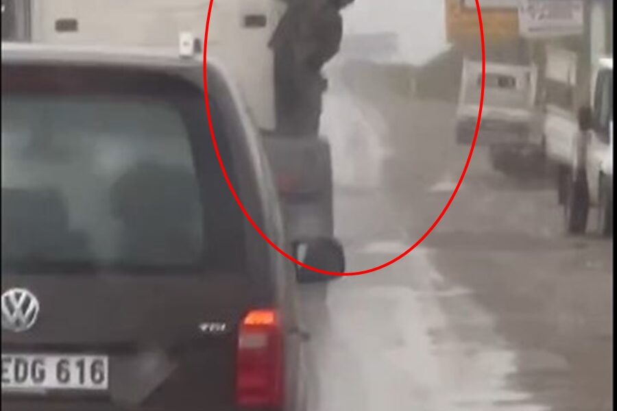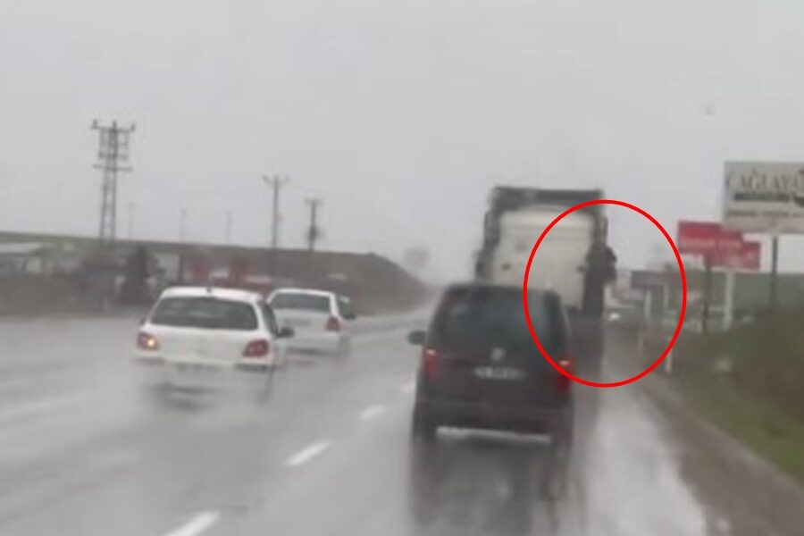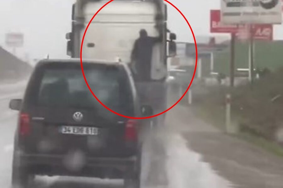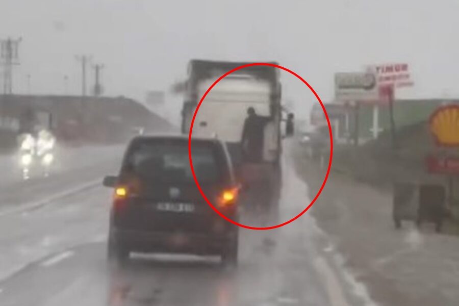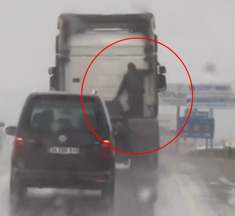 BATMAN’da yağmurlu havada TIR’ın arkasına tutunan bir kişinin tehlikeli yolculuğu, cep telefonu kamerasıyla kaydedildi.Batman-Diyarbakır Çevre Yolunda bir kişi, yağmurlu havada plakası öğrenilemeyen dorsesiz TIR’ın arkasına tutunarak yolculuk etti. O anlar, trafikteki başka bir sürücü tarafından cep telefonu kamerasıyla görüntülendi. Görüntülerde bir hafif ticari aracın da TIR’ın arkasında dörtlülerini yakarak ilerlediği görüldü.