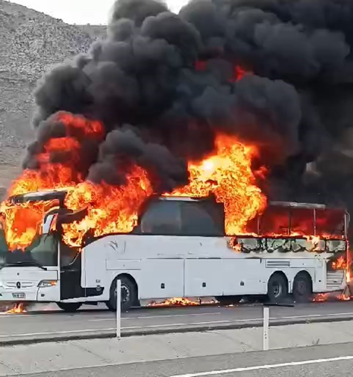 Batman-Hasankeyf kara yolunda akşam saatlerinde 34 EN 3737 plakalı bir tur şirketine ait olduğu belirtilen yolcu otobüsü, seyir halindeyken motor kısmından alev aldı. Durumu fark eden sürücü, otobüsü sağa çekerek yolcuları tahliye etti. İhbarla olay yerine itfaiye, sağlık ve jandarma ekipleri sevk edildi. Otobüsü saran alevler ekiplerin müdahalesiyle söndürüldü. Yolcu otobüsünün kullanılamaz hale geldiği yangın cep telefonu kamerasıyla kayda alındı.