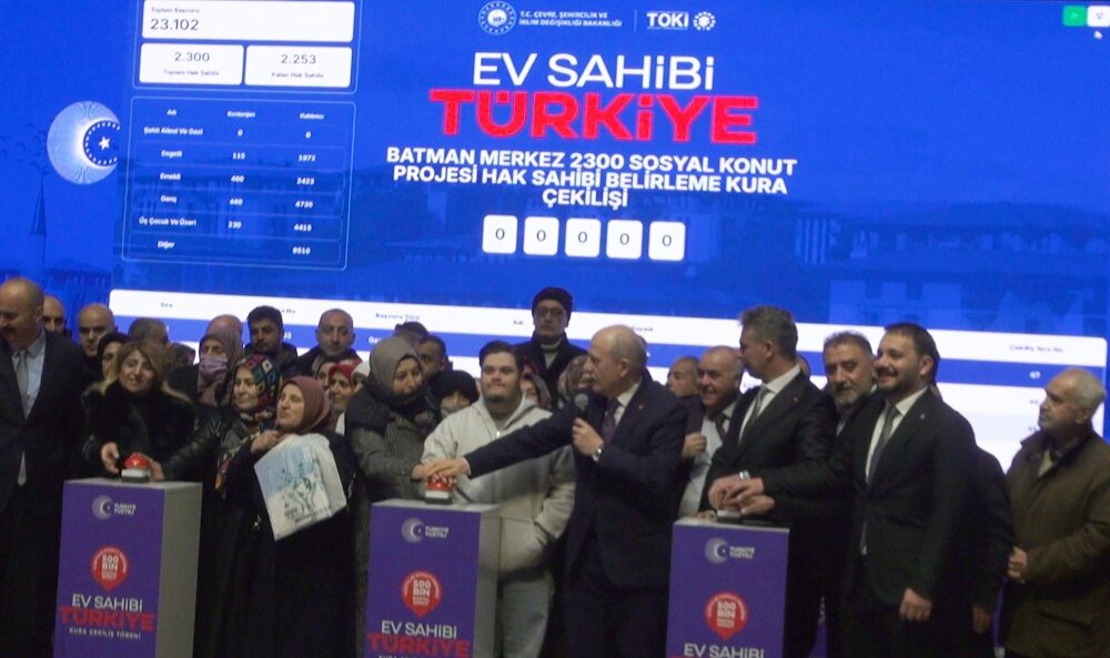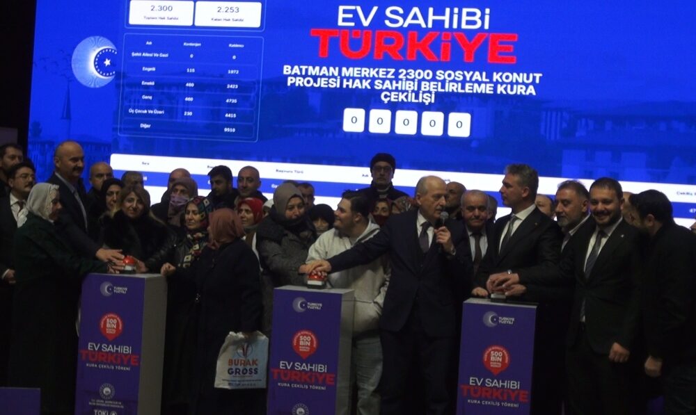 Çevre, Şehircilik ve İklim Değişikliği Bakanlığı ile Toplu Konut İdaresi Başkanlığı (TOKİ) tarafından yürütülen 500 bin sosyal konut projesi kapsamında Batman’da Necat Nasıroğlu Külliyesi’nde bulunan Hatice Nasıroğlu konferans salonunda kura çekimi gerçekleştirildi. Kura çekimini takip edenler için konferans salonunun dışında da dev ekran kuruldu. Törene; Çevre, Şehircilik ve İklim Değişikliği Bakan Yardımcısı Hasan Suver, Vali Ekrem Canalp, vali yardımcıları, TOKİ Daire Başkanı Fikret Dikkanoğlu, ilçe belediye başkanları ve vatandaşlar katıldı.