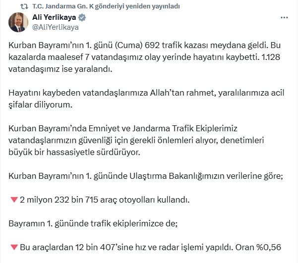 İçişleri Bakanı Ali Yerlikaya, bayram tatilinde kara yollarında meydana gelen kazalara ilişkin sosyal medya hesabından açıklama yaptı. Bakan Yerlikaya, “Kurban Bayramının 1inci günü 692 trafik kazası meydana geldi. Bu kazalarda maalesef 7 vatandaşımız olay yerinde hayatını kaybetti, 1128 vatandaşımız ise yaralandı. Hayatını kaybeden vatandaşlarımıza Allah’tan rahmet, yaralılarımıza acil şifalar diliyorum” dedi.