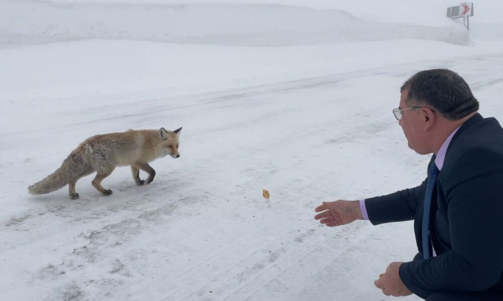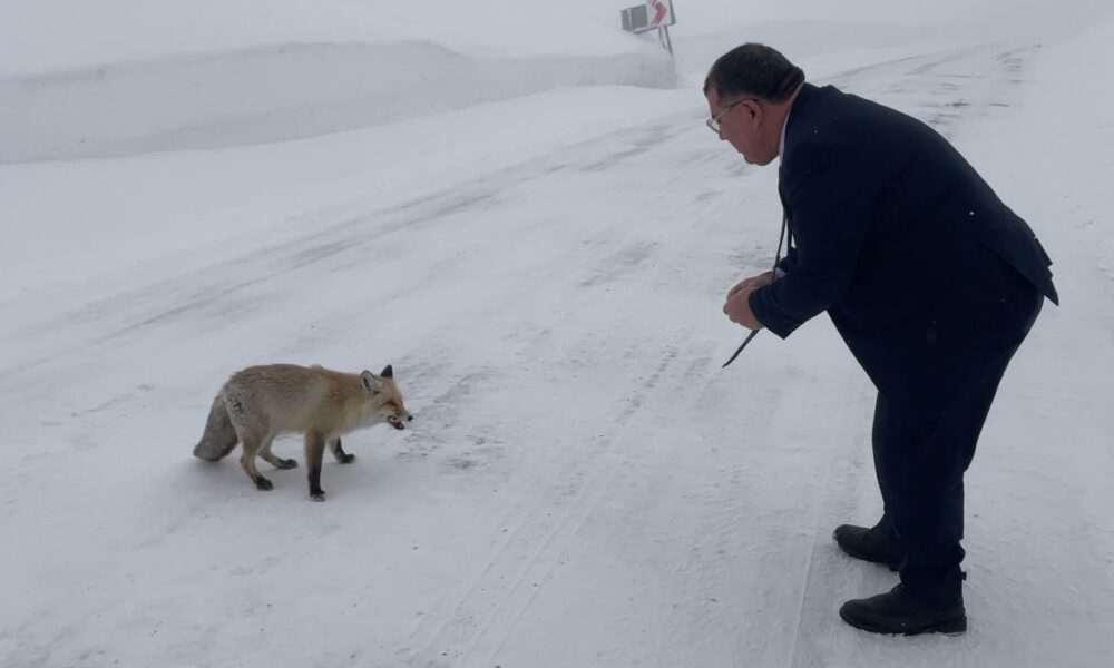 Belediye başkanı karlı yolda aç kalan tilkiyi eliyle besledi