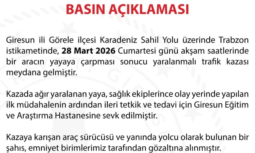 Giresun Valiliği de kazaya ilişkin yazılı açıklama yaptı. Açıklamada, “Akşam saatlerinde bir aracın yayaya çarpması sonucu yaralanmalı trafik kazası meydana gelmiştir. Kazada ağır yaralanan yaya, sağlık ekiplerince olay yerinde yapılan ilk müdahalenin ardından ileri tetkik ve tedavi için Giresun Eğitim ve Araştırma Hastanesi’ne sevk edilmiştir. Kazaya karışan araç sürücüsü ve yanında yolcu olarak bulunan bir şahıs, emniyet birimlerimiz tarafından gözaltına alınmıştır. Kazayla ilgili başlatılan tahkikat, çok yönlü olarak titizlikle devam etmektedir” denildi.
