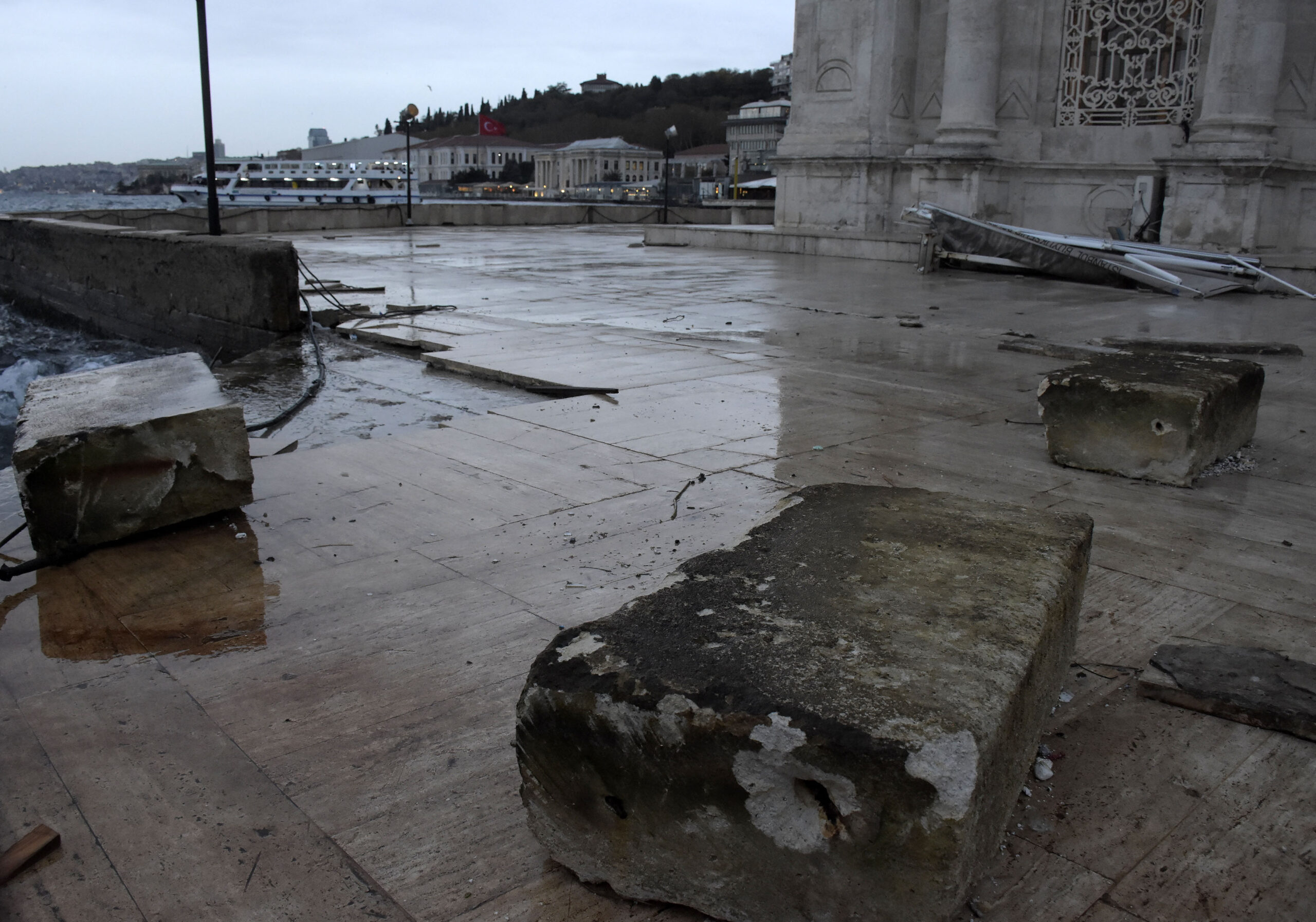 İSTANBUL’da geçtiğimiz hafta sonu etkili olan fırtına Ortaköy’deki Büyük Mecidiye Camii’nin avlusunda hasara yol açtı. Deniz kenarındaki beton bloklar fırtına ve dalgaların etkisiyle yerinden kopup avluya savruldu. Fırtına tenteleri yere düşürürken, avludaki mermerler de zarar gördü.