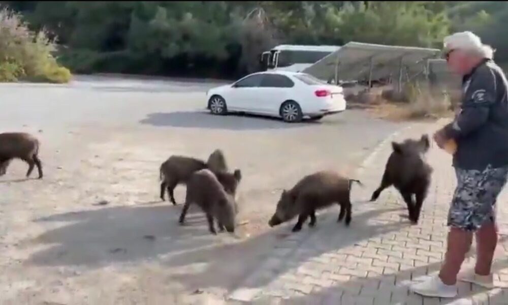 Kuşadasının Güzelçamlı Mahallesi’nde bulunan Dilek Yarımadası Milli Parkına gelen tatilci grubu, yaban domuzu sürüsünü elle beslemeye başladı. Tatilciler, domuzlara önce meyve daha sonra da ekmek attı. Bu sırada domuzlardan biri, tatilcinin elinden ekmeği kapmak isterken kolunu ısırdı. Yaşananlar, cep telefonu kamerasına anbean yansıdı.