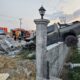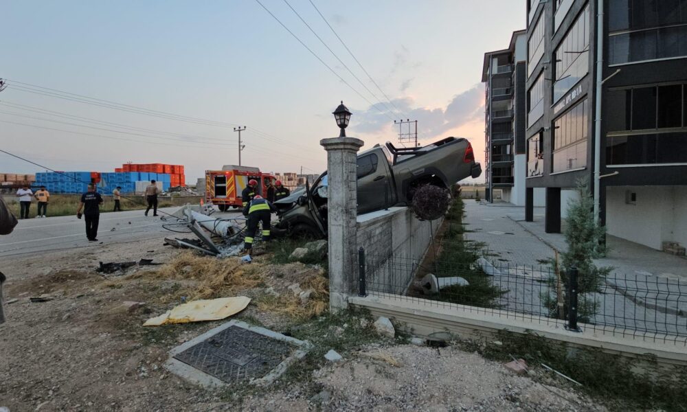 Beton direğe çarpan kamyonet, bahçe duvarında asılı kaldı