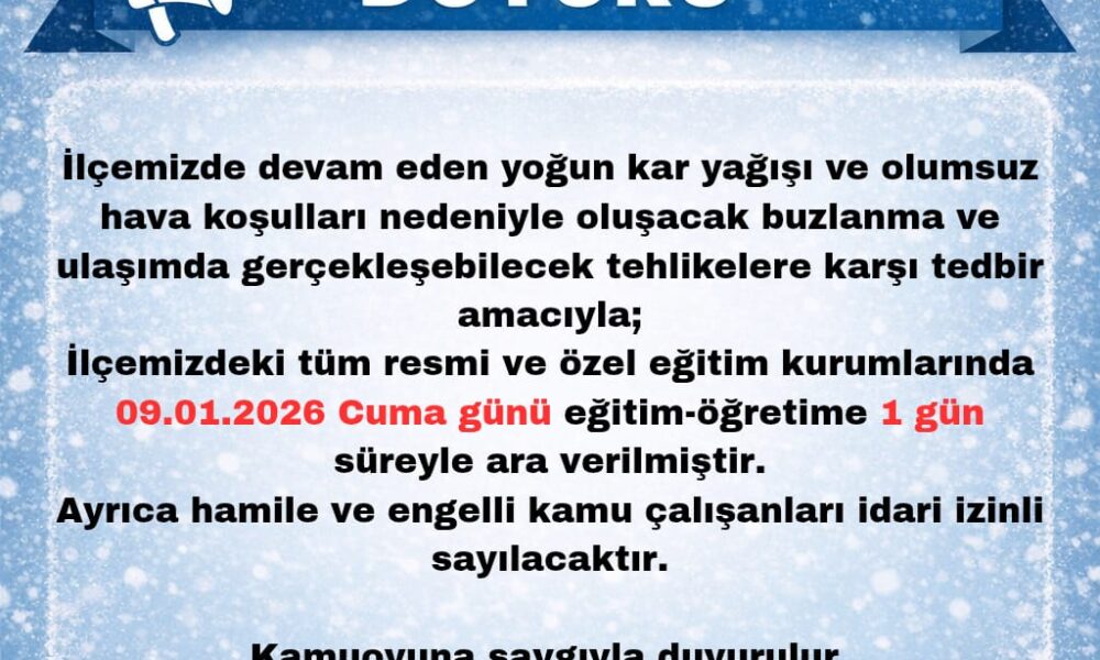 Karlıova Kaymakamlığı’ndan yapılan açıklamada, ilçede etkisini sürdüren yoğun kar yağışı, buzlanma ve ulaşımda yaşanabilecek olumsuzluklara karşı tedbir amacıyla eğitime 9 Ocak Cuma günü 1 gün ara verildiği belirtildi. Açıklamada, “İlçemizde devam eden yoğun kar yağışı ve olumsuz hava koşulları nedeniyle oluşacak buzlanma ve ulaşımda gerçekleşebilecek tehlikelere karşı tedbir amacıyla; ilçemizdeki tüm resmi ve özel eğitim kurumlarında 09.01.2026 Cuma günü eğitim-öğretime 1 gün süreyle ara verilmiştir. Ayrıca hamile ve engelli kamu çalışanları idari izinli sayılacaktır” denildi.