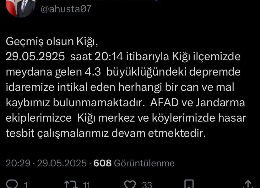 Bingöl Valisi Ahmet Hamdi Usta, sosyal medya hesabından yaptığı paylaşımda, “29.05.2025 saat 20:14 itibarıyla Kiğı ilçemizde meydana gelen 4.3 büyüklüğündeki depremde idaremize intikal eden herhangi bir can ve mal kaybımız bulunmamaktadır. AFAD ve Jandarma ekiplerimizce Kiğı merkez ve köylerimizde hasar tespit çalışmalarımız devam etmektedir” dedi.