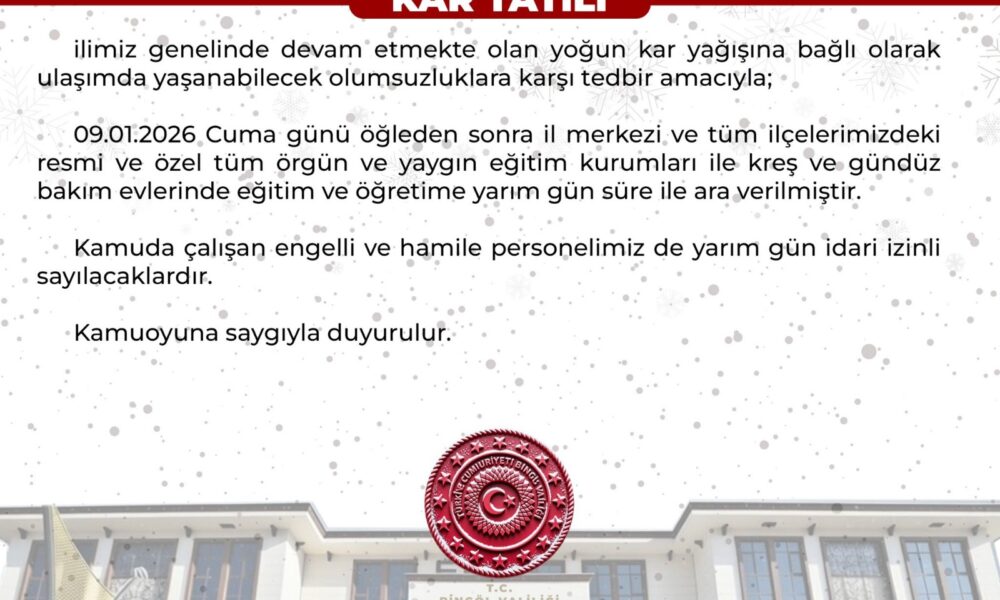 Bingöl Valiliğinden yapılan açıklamada, “İlimiz genelinde devam etmekte olan yoğun kar yağışına bağlı olarak ulaşımda yaşanabilecek olumsuzluklara karşı tedbir amacıyla; 09 Ocak 2026 Cuma günü öğleden sonra il merkezi ve tüm ilçelerimizdeki resmi ve özel tüm örgün ve yaygın eğitim kurumları ile kreş ve gündüz bakımevlerinde eğitim ve öğretime yarım gün süre ile ara verilmiştir. Kamuda çalışan engelli ve hamile personelimiz de yarım gün idari izinli sayılacaklardır” denildi.