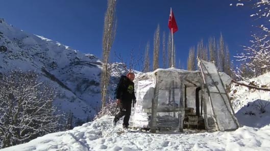 ERZURUM’un İspir ilçesinin kırsal Yedigöl Mahallesi’nde oturan ve yörede ‘Dağların oğlu’ olarak tanınan Bülent Erkan (42) son bir yıldır tek başına ormanda yaşıyor. Kendi imkanlarıyla kurduğu, etrafını naylonla kapladığı elektriği olmayan barakada teknolojiden uzak bir yaşam süren Erkan, yemeğini ve çayını kar suyunu eriterek yapıyor. Yiyeceğini doğadan karşılayan Erkan, fırsat buldukça da yaban hayvanlarını görüntülüyor.