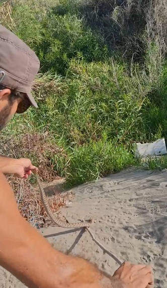 Bölgedeki yaban hayatı için yaz sezonu boyunca gece-gündüz çalıştıklarını belirten Tural, “Kumsalın batı alt kısmı için bu sabah yaptığımız son arazide yumurtalarından çıkan 5 kaplumbağa yavrusunun yanı sıra denk geldiğimiz bu koca engereğe de yardımcı olduk. Kıyıda sıcaktan yengeç yuvalarına girmeye çalışıyordu. Hareketinde anormal bir durum olduğunu fark ettik. Sonra çubuk yardımı ile kaldırdığımda ağzında yuttuğu tuzlu suyu çıkardı, akabinde hareketlenme de başladı. Umarım hayatına kaldığı yerden devam eder” dedi.
