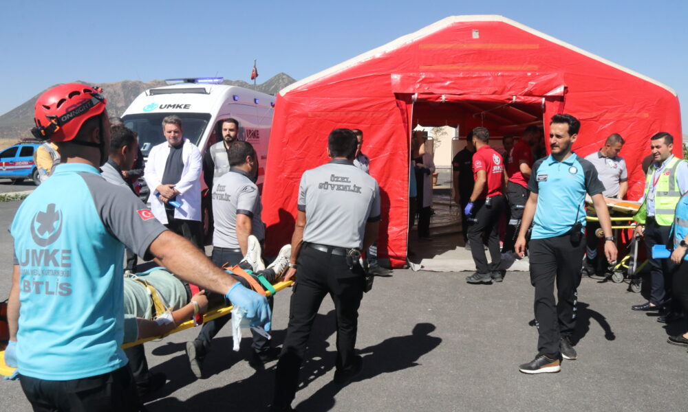 Senaryo gereği Muşun Varto ilçesinde dün saat 13.00 sıralarında 6.9 büyüklüğünde deprem meydana geldi. Şiddetli deprem Bitliste de yıkıma neden oldu, Tatvan Devlet Hastanesinin bir bölümü ağır hasar aldı. Bölgedekiler, hastanenin ağır hasar aldığına dair ihbarda bulundu. İhbar sonrası bölgeye İl Sağlık Müdürlüğü koordinesinde oluşturulan Afet ve Acil Durum Müdürlüğü (AFAD), UMKE, itfaiye, emniyet ve 112 ekipleri yönlendirildi. Ekipler, hastanede tedavi gören hastalar ile depremde yaralananları tahliye etti. Hastane bahçesinde kurulan sahra hastanesinde ilk müdahaleleri yapılan yaralılar, feribotla Van Gölü üzerinden Vandaki hastanelere nakledildi. Gerçeği aratmayan ve 5 saat süren tatbikatta 97 personel, 19 araç, 4 bot ve 1 feribot görev alırken, ekipler canla başla mücadele yürüttü.