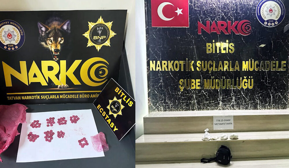 İl Emniyet Müdürlüğü Narkotik Suçlarla Mücadele Şubesi ekipleri, Tatvan ilçesindeki uygulama noktasında yol kontrolü sırasında bir yolcu otobüsünü durdurup, arama yaptı. Ekipler, şüpheli hareketleriyle dikkat çeken yabancı uyruklu 1 kişiyi gözaltına aldı. Şüphelinin yanındaki el çantasında dedektör köpekle birlikte yapılan aramada 778 gram metamfetamin ele geçirilirken, kontrollerde durdurulan iki araçta ise 300 gram metamfetamin ve 80 adet uyuşturucu ve uyarıcı özelliği bulunan ekstazi ele geçirildi. Gözaltına alınan 1i yabancı uyruklu 5 şüpheli, çıkarıldıkları mahkemece tutuklandı.