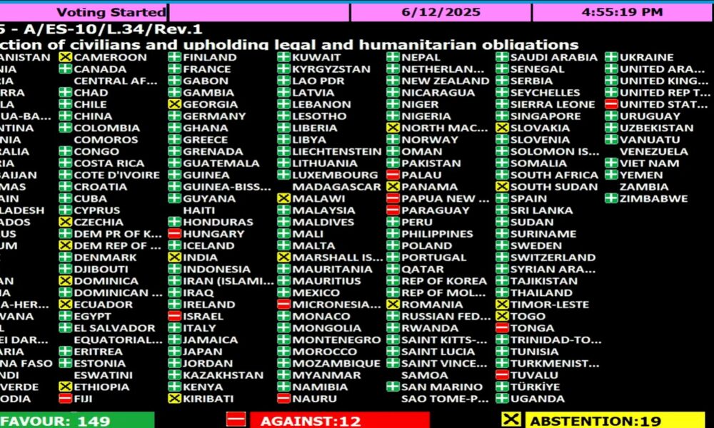 Birleşmiş Milletler Genel Kurulunun (BMGK) bugün yapılan olağanüstü toplantısında, Gazzede derhal, koşulsuz ve kalıcı bir ateşkes, tüm rehinelerin serbest bırakılması ve kıtlığı önlemek için insani yardımın yeniden başlatılması talep eden tasarısı oylandı. Oylamada, 193 üye ülkeden 149u evet oyu ile tasarıya desteklerken, 12 ülke karşı çıktı, 19 ülke ise çekimser kaldı.