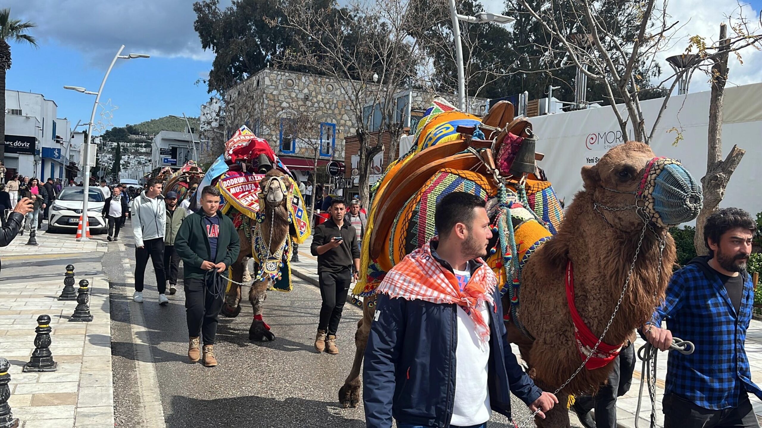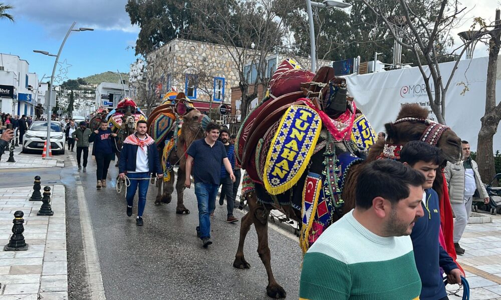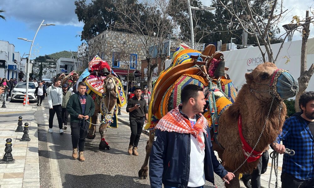 MUĞLAnın Bodrum ilçesinde festival öncesi 6 deve, kortej eşliğinde meydana kadar yürüdü. O anlar, turistler tarafından cep telefonu kamerası ile görüntülendi. Kızılağaç Mahallesindeki Deve Güreşi Arenasında yarın Bodrum Belediyesinin destekleriyle Çanakkale, Denizli, Antalya, İzmir, Aydın, Balıkesir ve Muğladan olmak üzere 130 devenin mücadele edeceği Geleneksel Bodrum Deve Güreşi Festivali düzenlenecek. Etkinlik öncesi, bugün kortej yürüyüşü yapıldı. 6 devenin yer aldığı kortej yürüyüşü, Bodrum Otobüs Terminalinden başlayarak Cevat Şakir ve Neyzen Tevfik caddelerinde sürdü, ardından Turgutreis Caddesinde son buldu. Terminalde ve yolda develeri bir anda karşılarında görenler, şaşırdı. Süslü develeri gören Bodrumlular ve ilçedeki turistler, bu anları, cep telefonları ile kaydetti.