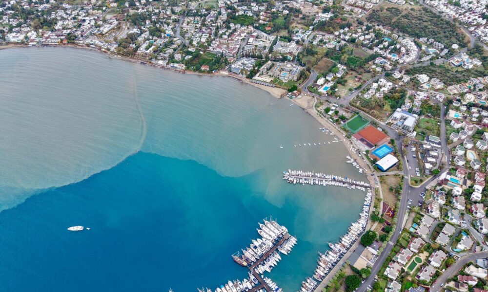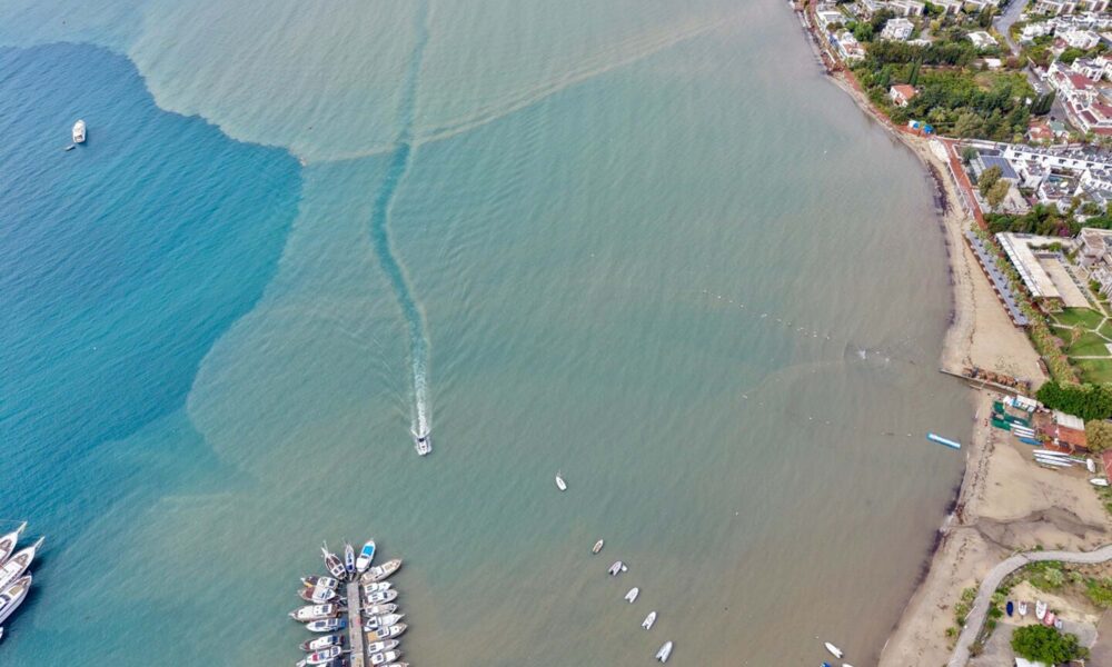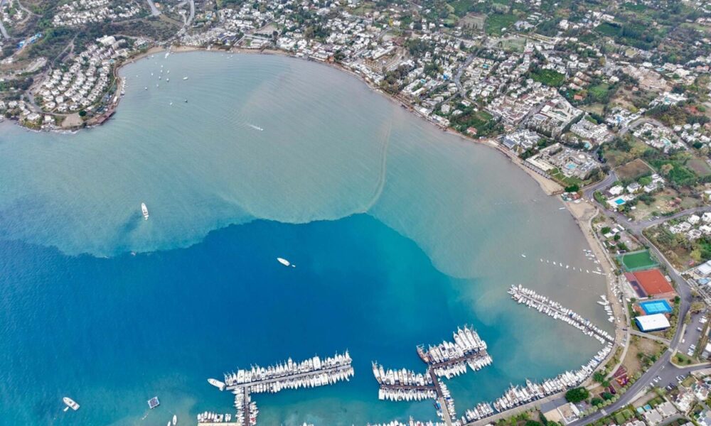 Muğla'nın Bodrum ilçesinde sağanak etkili oldu. Derelerden çamurlu su, denizde renk değişimine neden oldu. Fotoğraf: Bodrum (Muğla),(DHA)
