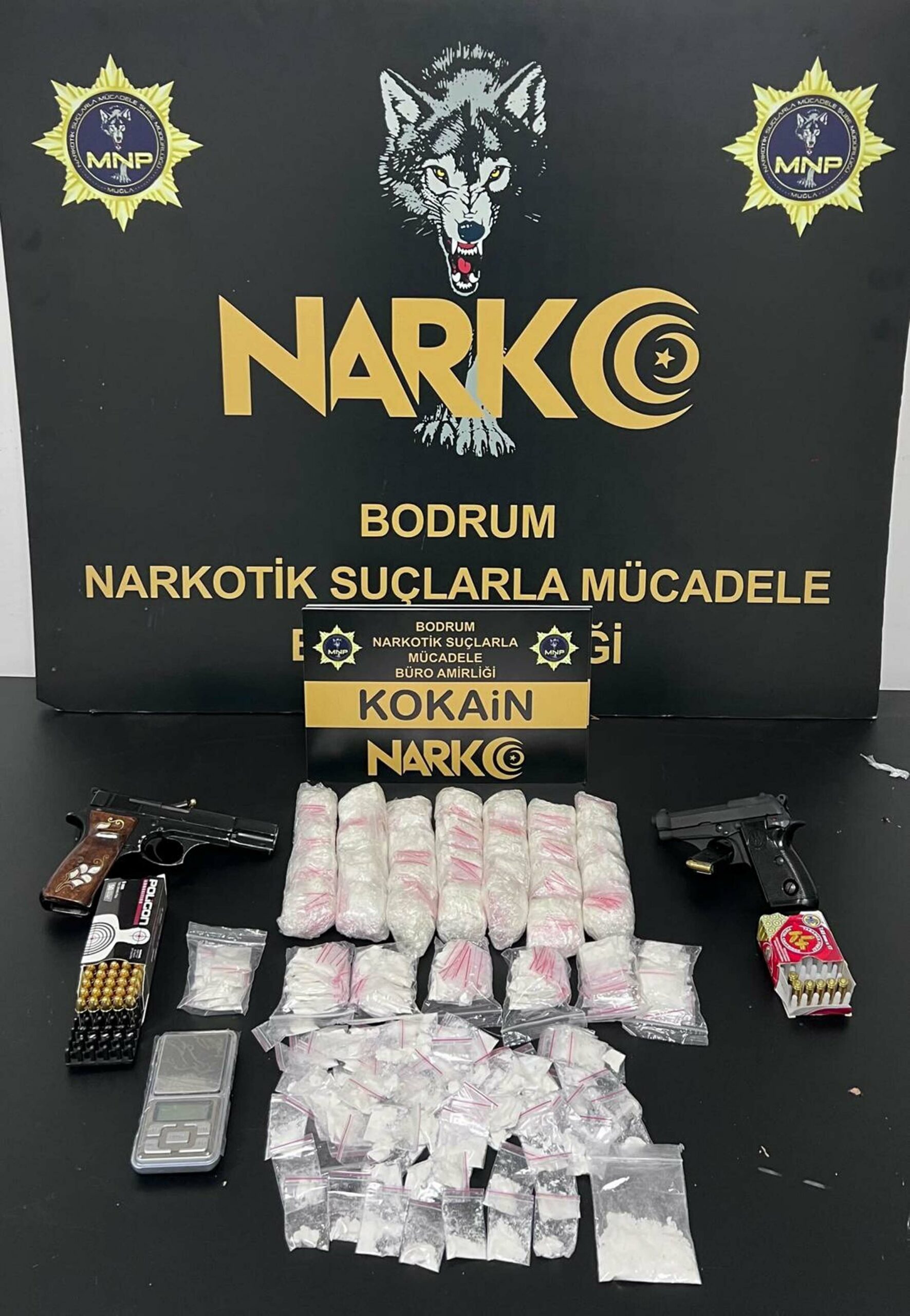 Muğla İl Emniyet Müdürlüğü Narkotik Suçlarla Mücadele Şubesi ekipleri, Bodrumda piyasaya uyuşturucu madde sürüleceği bilgisine ulaşıldı. 8 Temmuz günü şüphelilerin evlerine düzenlenen operasyonda narkotik köpeği Tina ile arama yapıldı. Cumhuriyet Başsavcılığı koordinesinde gerçekleştirilen operasyonda 765 paket kokain, 2 ruhsatsız tabanca, 47 mermi, 21 bin 930 lira ve 1 hassas terazi ele geçirildi, 3 şüpheli gözaltına alındı.