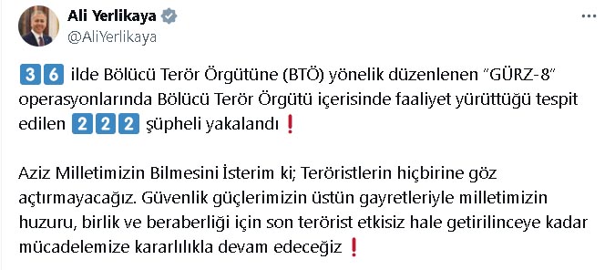 Bakan Yerlikaya, sosyal medya hesabından yaptığı açıklamada, Emniyet Genel Müdürlüğü Terörle Mücadele Daire Başkanlığı ve İstihbarat Başkanlığı koordinesinde, bölücü terör örgütü mensuplarının yakalanmasına yönelik 36 ilde Gürz-8 operasyonları düzenlendiğini belirtti. Buna göre; örgütün kırsal kadrolarına katılacakları belirlenen, bölücü terör örgütü içerisinde geçmiş tarihlerde faaliyette bulunan, sosyal medyada terör örgütü propagandası yapan, terörizme finansman sağlayıp, iş birlikçilik ve kurye faaliyetlerinde bulunan, örgütün Avrupa yapılanması içerisinde faaliyet gösteren ve haklarında kesinleşmiş hapis cezası ve aranma kaydı bulunduğu tespit edilen toplam 222 şüpheli yakalandı. Operasyonlar sonucu çok sayıda ruhsatsız tabanca, av tüfeği, yüklü miktarda döviz ve Türk lirası ile dijital materyal ve örgütsel doküman ele geçirildi.
