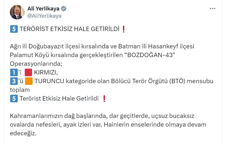 Bakan Yerlikaya, “Şehitlerimizin kanı yerde kalmadı. Operasyonu gerçekleştiren Hava Kuvvetleri Komutanlığımızı, kahraman jandarmamızı ve güvenlik korucularımızı tebrik ediyorum. Allah ayaklarına taş değdirmesin. Milletimizin duası sizinle. Son terörist etkisiz hale getirilinceye kadar durmayacağız, duraksamayacağız. Kahramanlarımızın dağ başlarında, dar geçitlerde, uçsuz bucaksız ovalarda nefesleri, ayak izleri var. Hainlerin enselerinde olmaya devam edeceğiz” dedi.